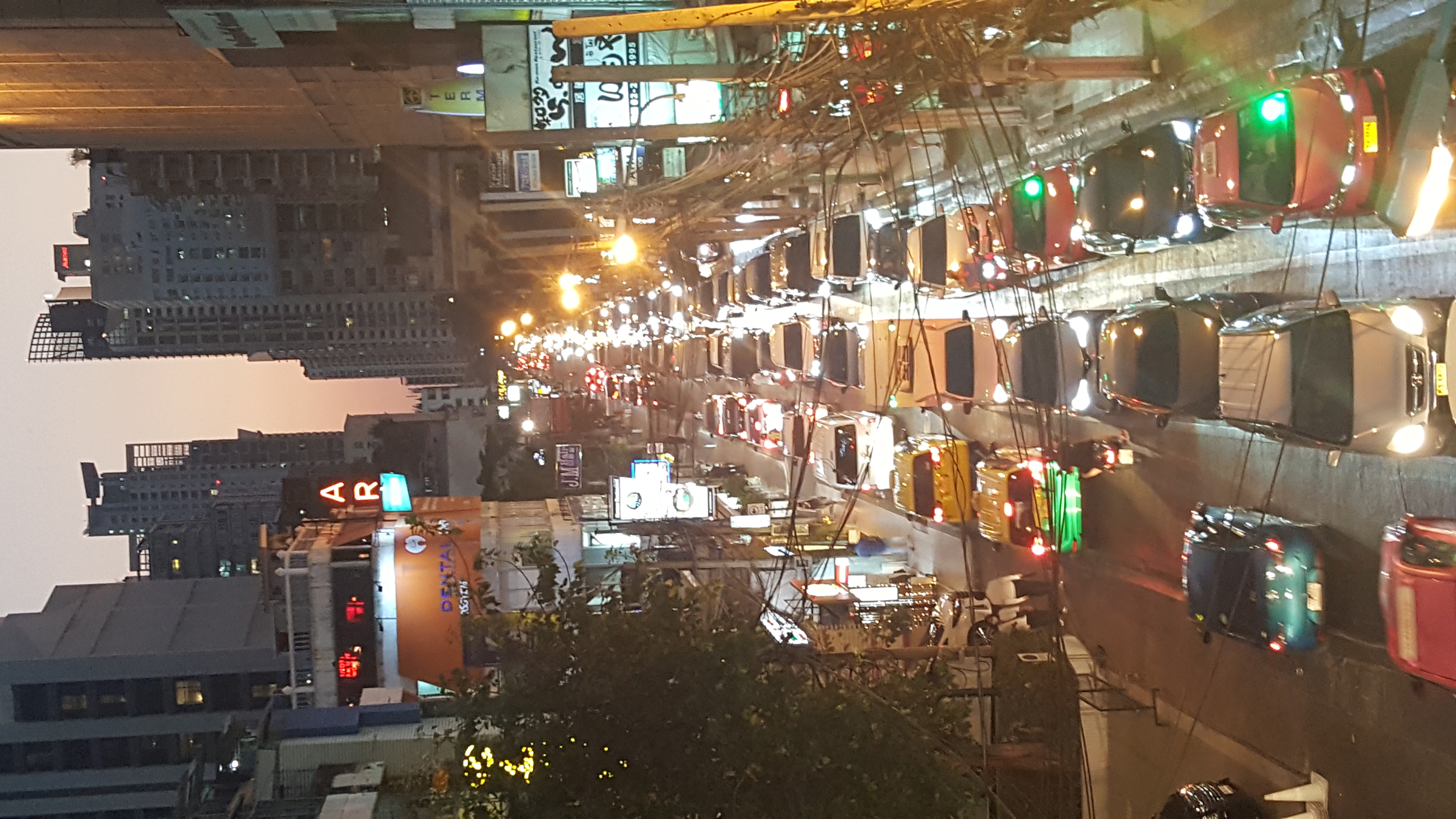 An early view of bustling traffic (and life!!) in Sukhumvit Soi 24 on the evening of the first day back at work, (for many,) after the long New Year holidays in January, 2020. View from the West-bound platform at the BTS (Skytrain) station at Pomprong.