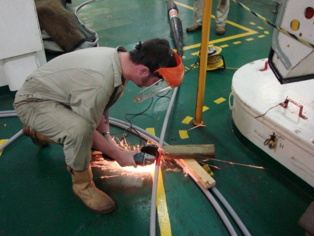 Systems Technician Gary Muncaster hard at work aboard the cable repair ship c.s. Pacific Guardian, whilst on a telecommunications cable repair in the middle of the North Atlantic Ocean.