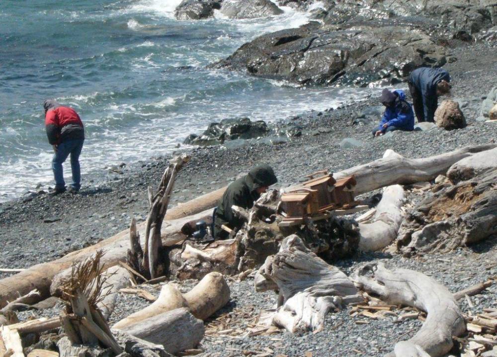 An old man on the seashore near Ogden Point, Victoria B.C., Canada. He had bought along some woodworking tools and was busy turning the pile of driftwood around him into intricate little birdhouses.