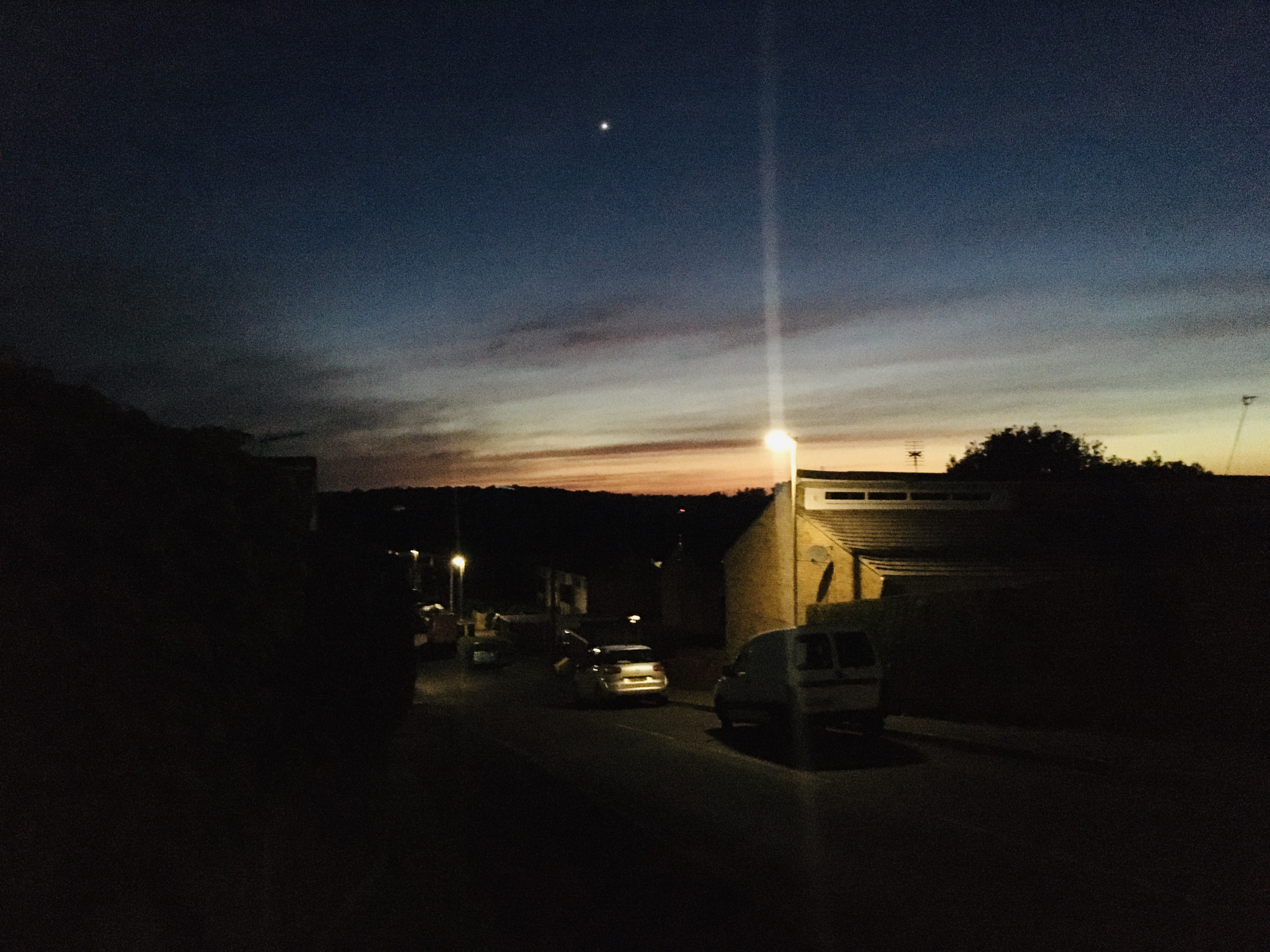 Sunset, lamplight and Venus across Worldham Hill, Hampshire, England