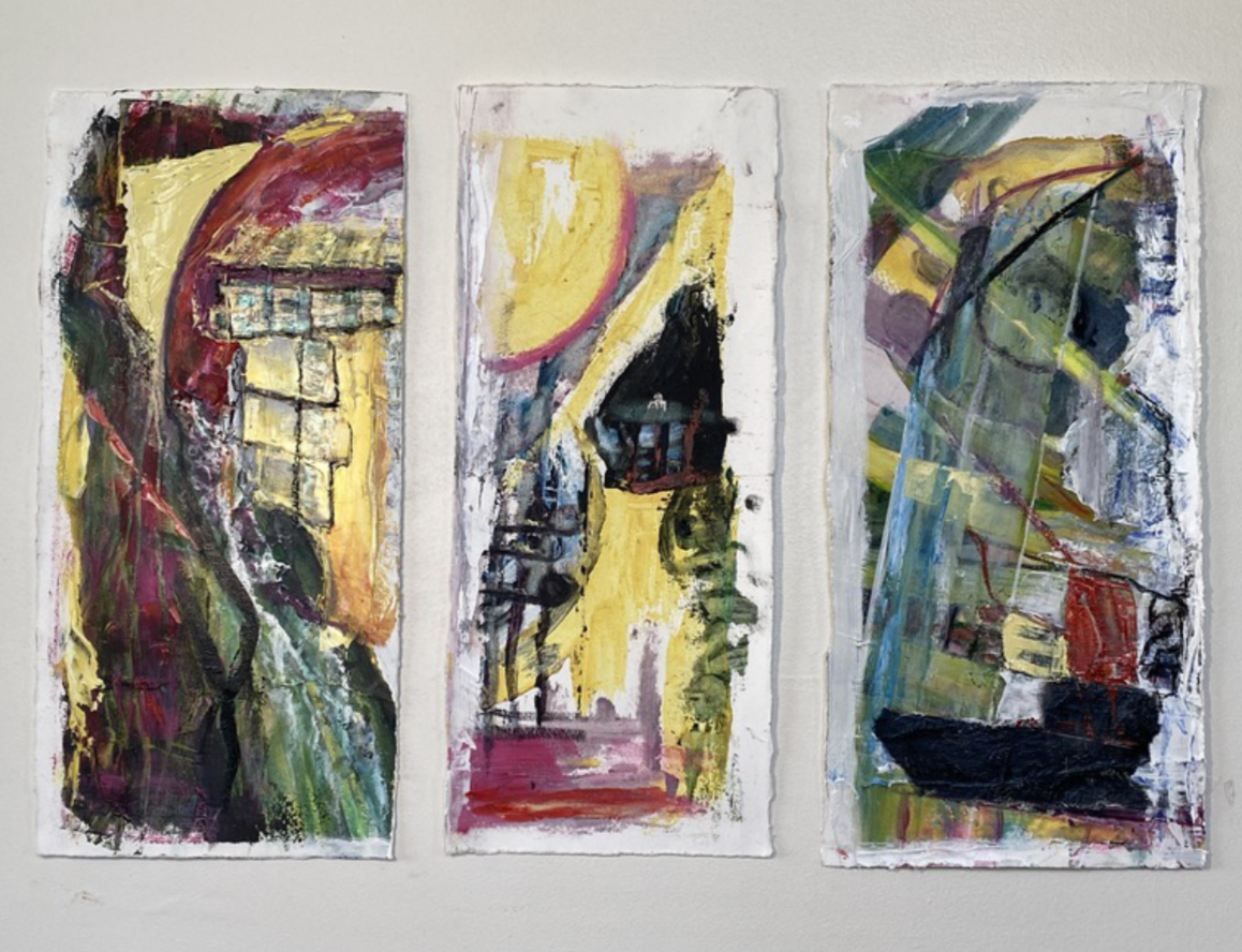 Title: Abstract In Thirds oil and cold wax on paper 22 1/2 x 15 1/2 unframed Can be mounted together or sold separately.