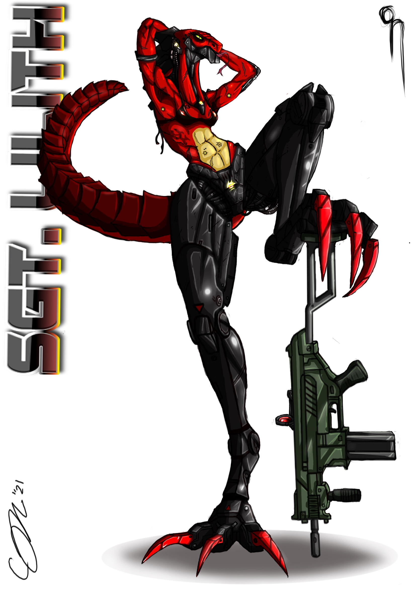 "Hailing from the world Xanax in the Skor nebula, put your hands together for Sargent Lilith of the RRTU. Even after losing her legs to a trip mine, this fiery female was figuratively and literally back on her feet in a month! She may be part Cyborg but she's all woman! Lilith likes Sunbathing and fruit, dislikes snow and small critters! "