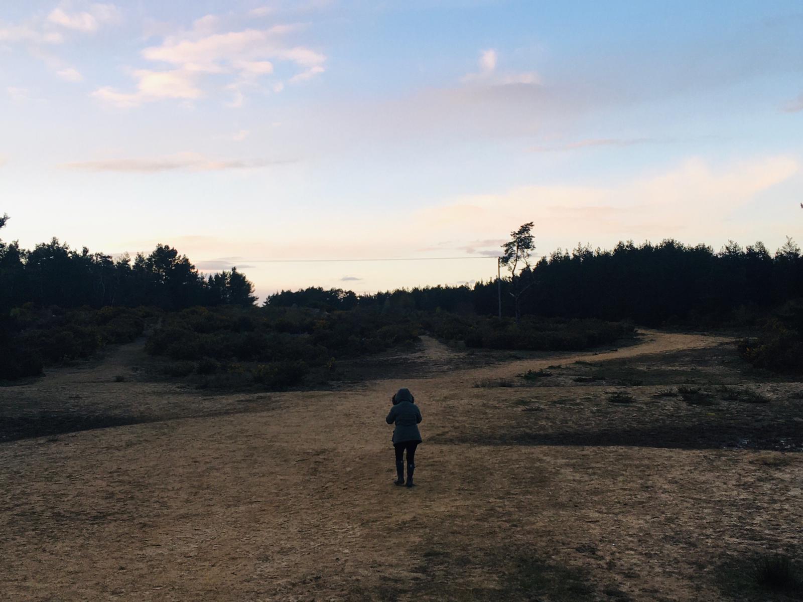 A lone figure is silouhetted as they walk through the Hogmoor Inclosure on an unseasonably cold April Evening.