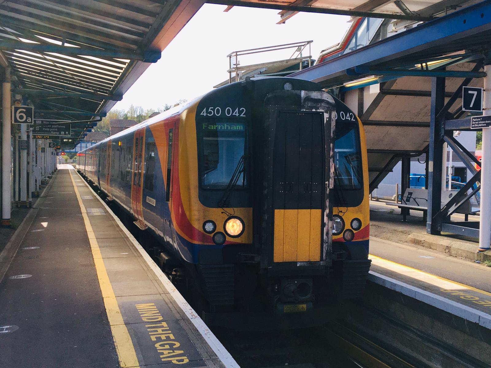 Unit 450 042 waits at Platform 6/7 at Guildford with the 11:23 Guildford to Farnham service on 26/04/2021