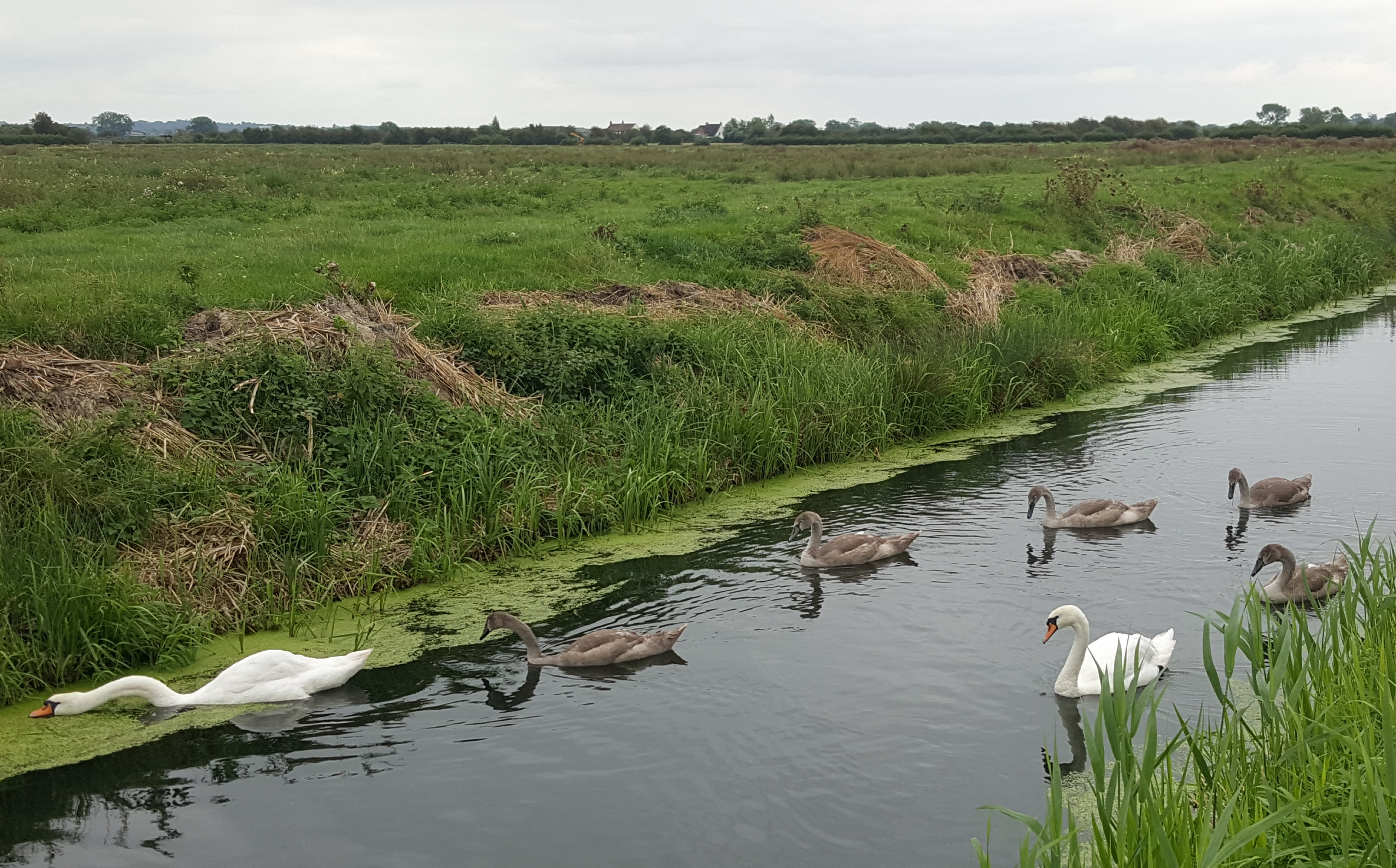 A family of swans on the Mark Yeo near Rooks Bridge in Somerset.