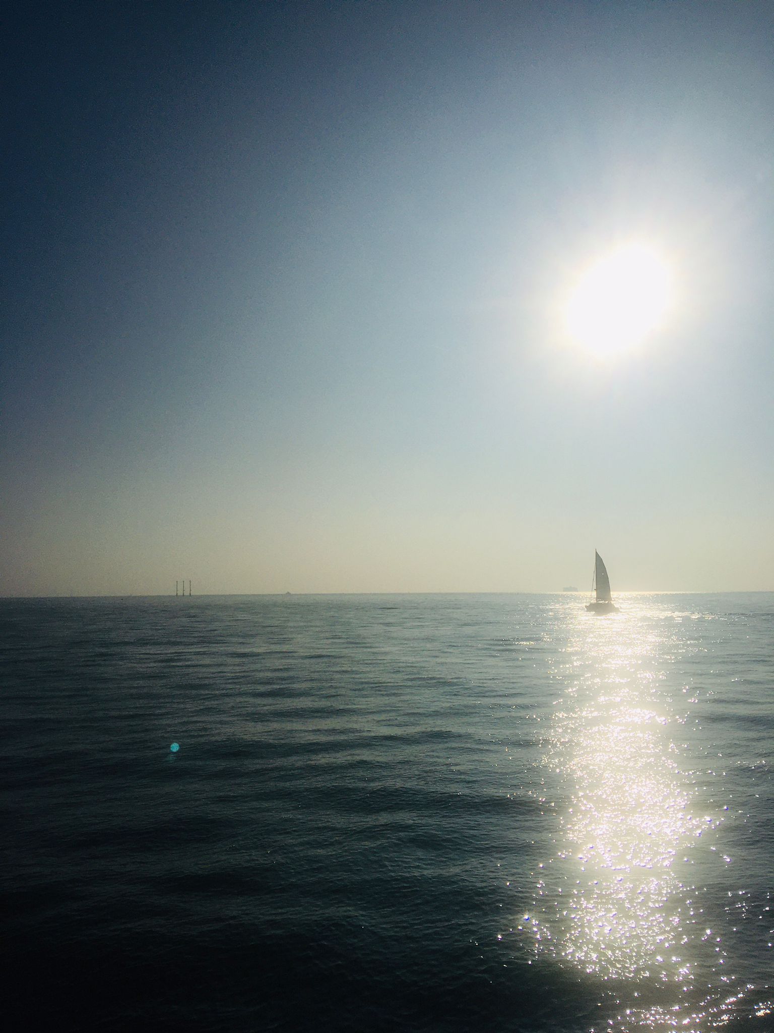 The Sun is shining across the Solent (between Portsmouth and Ryde Isle of Wight) and catches a yacht in its rays.