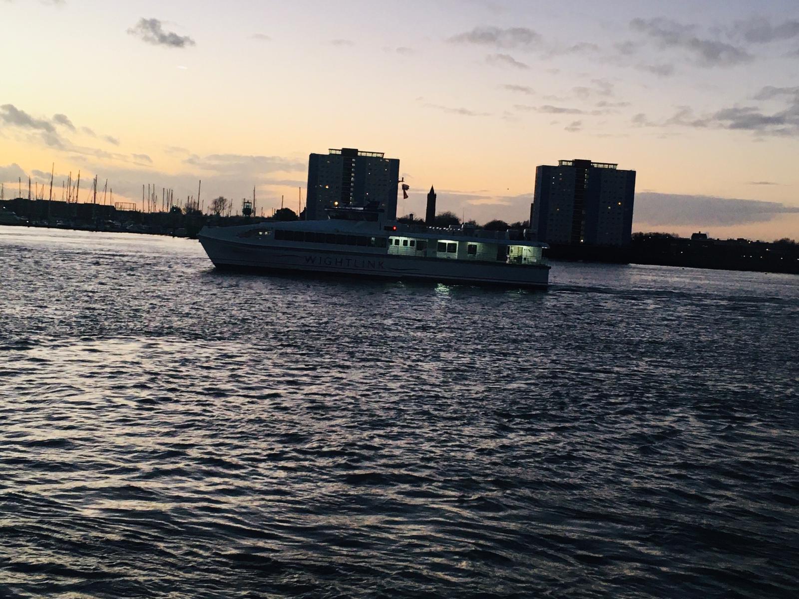 Wight Ryder I sails out of Portsmouth Harbour again, against the backdrop of a Winter late Sunset over Gosport forming the 16:15 sailing to Ryde Pier Head.