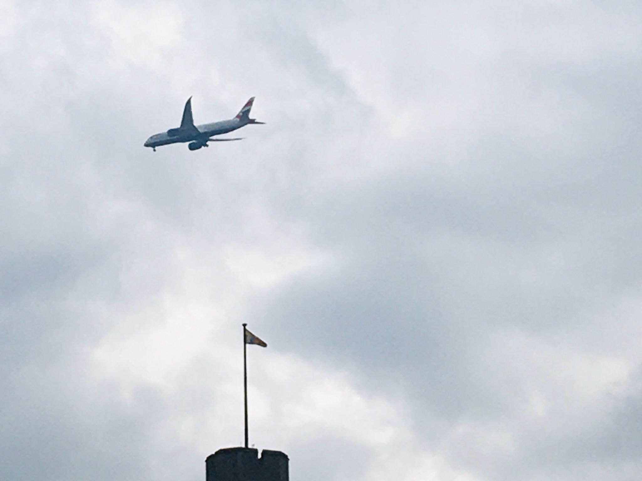Flight BA248 from Rio De Janeiro (Boeing 787-8 Dreamliner G-ZBJK) lowers it's landing gear on the final approach to London Heathrow Airport. On approach it flys over Windsor Castle where the "Royal Standard" shows the Queen is in residence. Photo taken from Platform 1 at Windsor & Eton Riverside Railway Station.