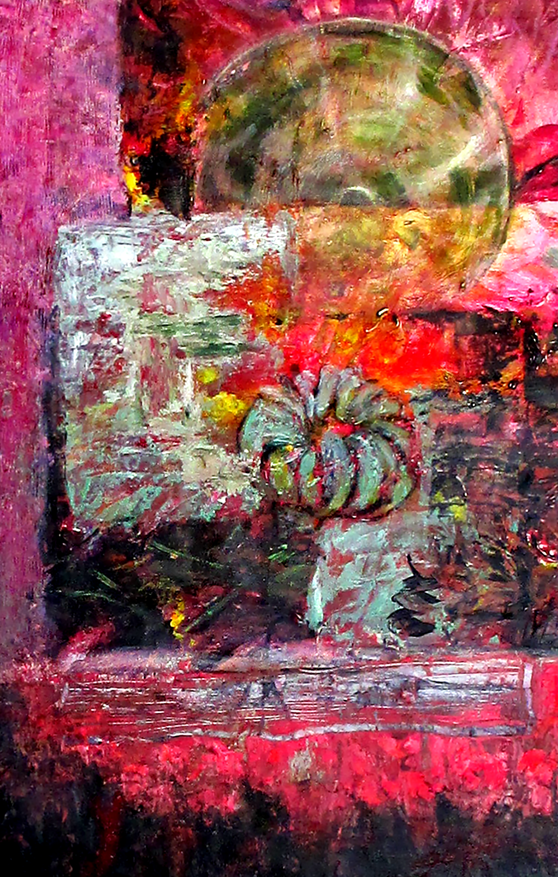 Vibrant colors in reds, black and yellows surround the subtle emerging flower bud.