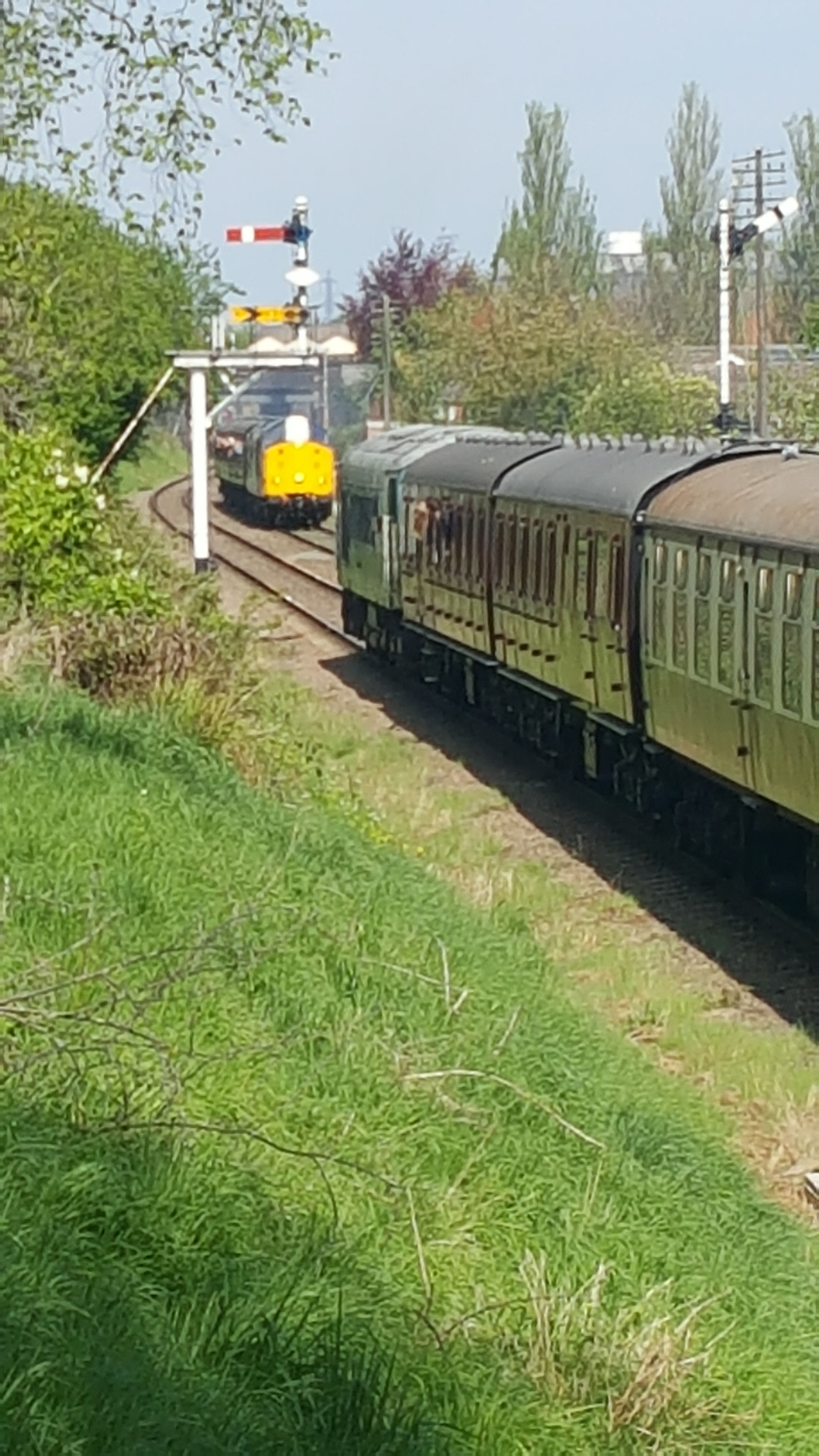 Class 45 diesel, D123 waiting at a signal on the down line with another diesel-hauled train passing on the up line.