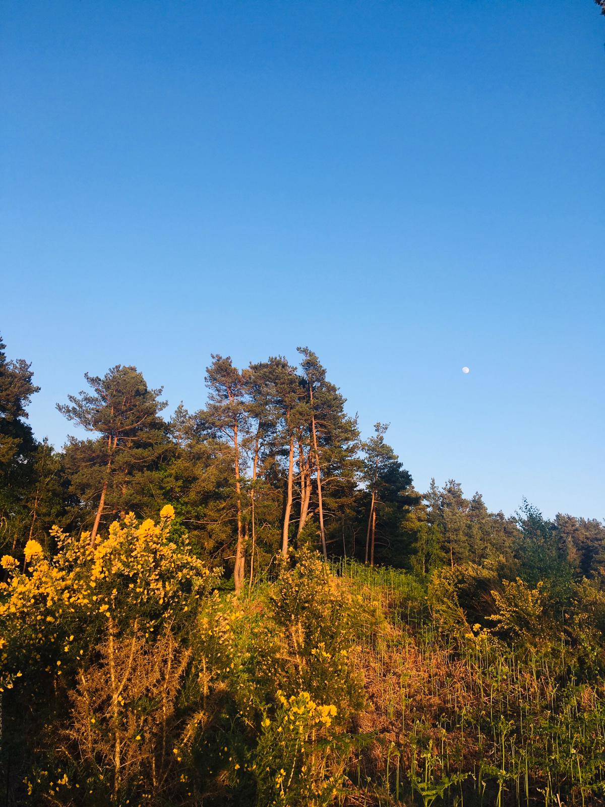 The Sun is setting in the West, and the golden rays are picking up the beautiful yellow flowers from the Gorse and Broom in the Hogmoor Inclosure! Meanwhile high above the Scots Pines, the Moon looks down over the beautiful scene.