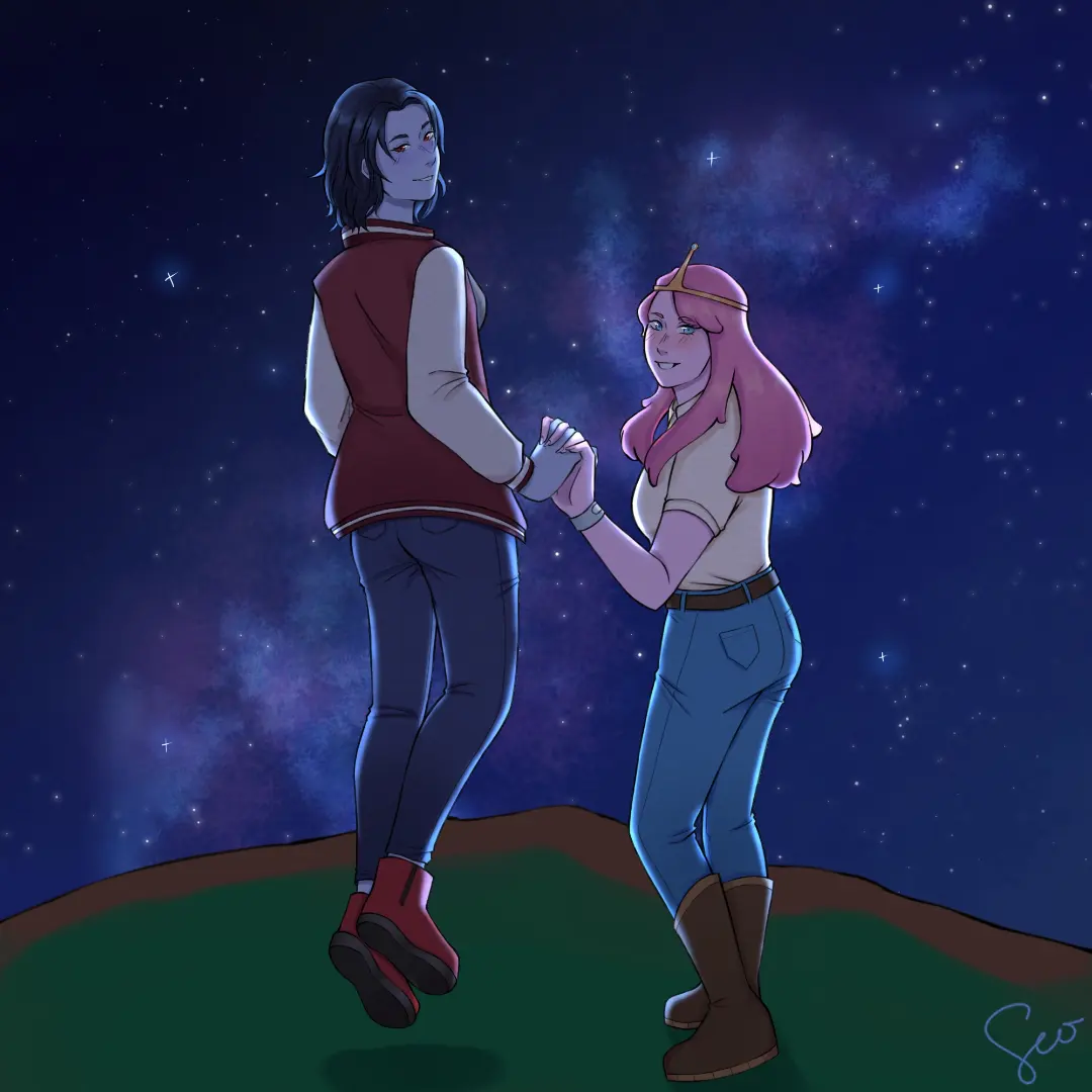 My partner gave this to me as a gift (inspired by marceline and princess bubblegum of adventure time) ART COMMISSION - ARTIST: seo.draws (go follow her on instagram if you want to see more <3
