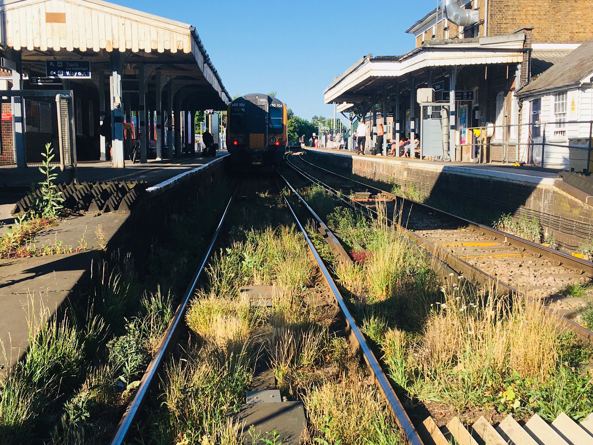 Despite nature appearing to be rapidly taking over, Farnham Railway Station is far from abandoned and a Class 450 Desiro has just arrived on a service from Guildford!