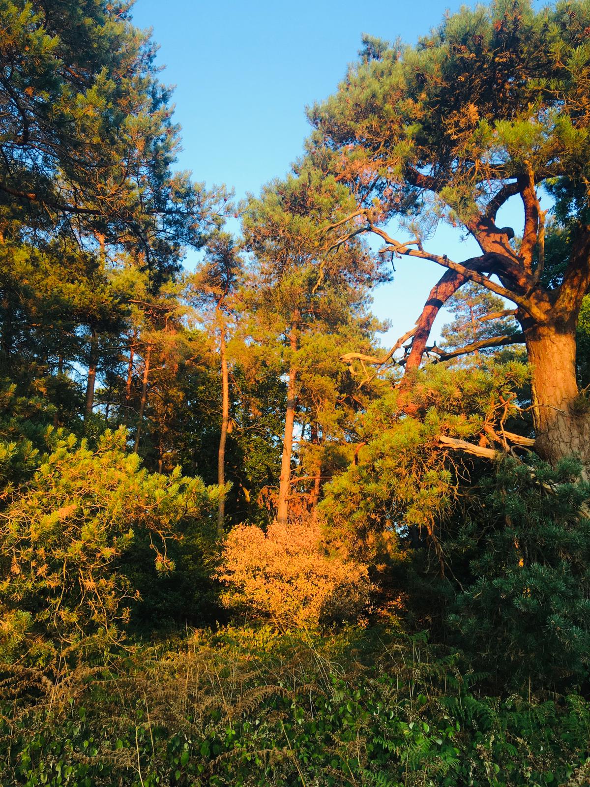 The Sun is setting casting a golden glow onto the Scot’s Pine trees in the Hogmoor Inclosure. It is already past 20:30hrs and the Sun is very low in the sky.
