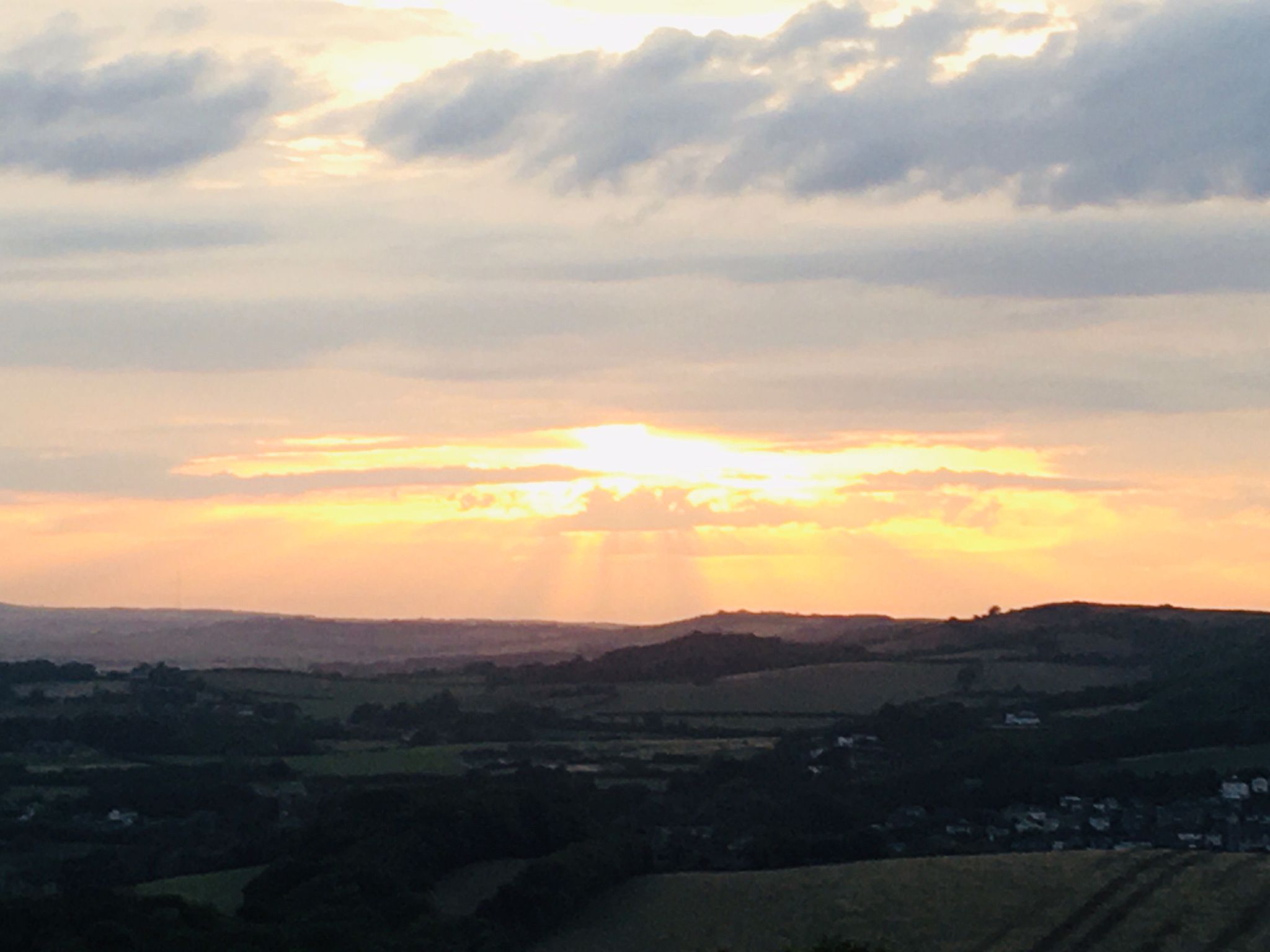 The Sun is setting to the West over the Isle of Wight and casting its rays over the Island. The view from Bembridge Fort on Culver Down.
