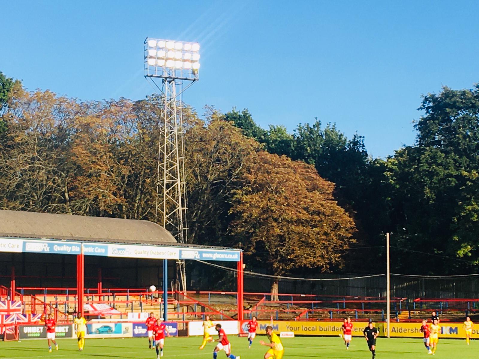 Aldershot record a magnificent 5-1 victory over FC Halifax in the English Conference National. The game was on “Live” TV with BT Sport, and this probably explains whilst in bright Sunlight, the floodlights are on!
