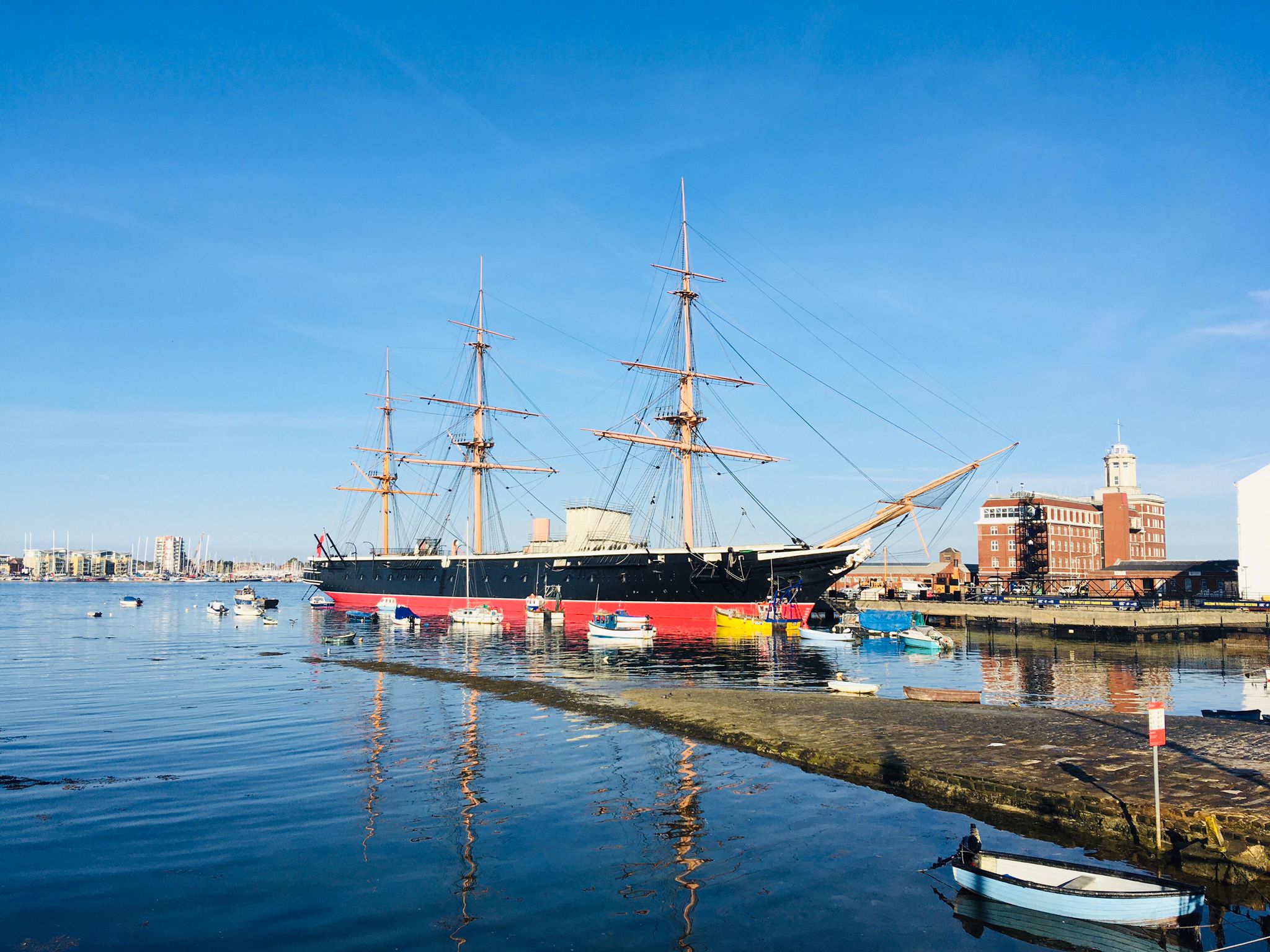 HMS Warrior at Portsmouth Harbour on a September morning.