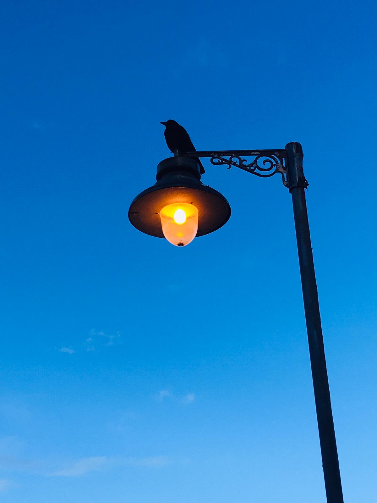 A crow sits surveying the scene on a lamppost on Ryde Pier on the Isle of Wight.