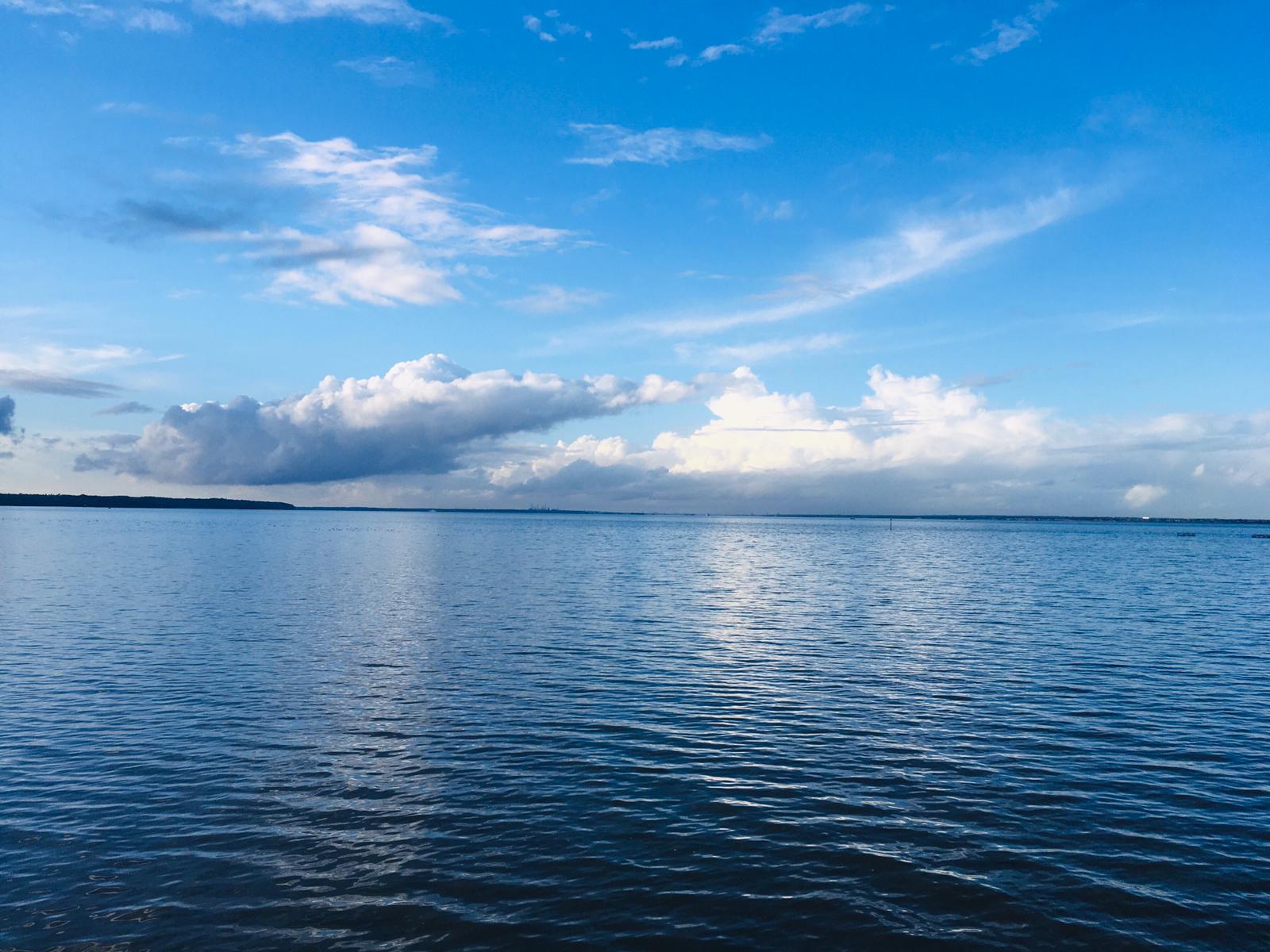 A view over the Solent from Ryde Pier on the Isle of Wight showing the clouds over Fawley Oil Refinery. It has been a stormy day, but that has now passed.