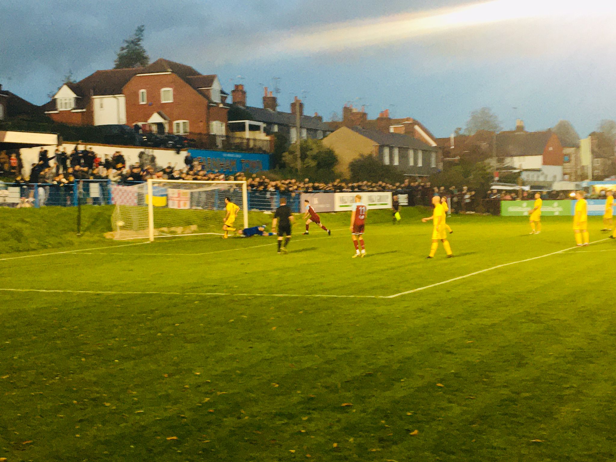 Farnham Town score on the rebound from a missed penalty under the floodlights. Sadly for Farnham the game finished 2-1 to opponents Tadley Calleva in the Combined Counties League.
