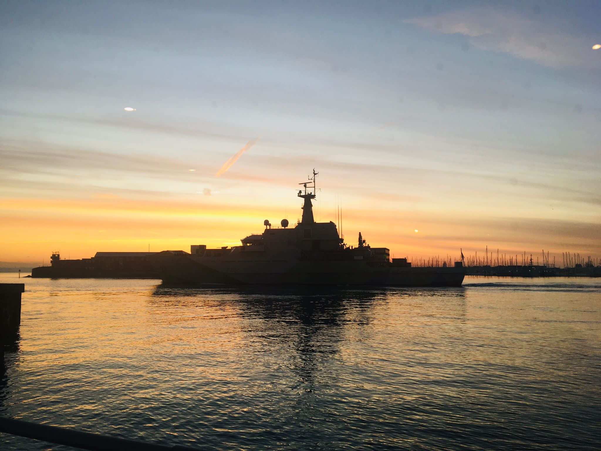 HMS Severn (one of the Royal Navy’s River Class ships) slips quietly out of Portsmouth Harbour in the Sunset.