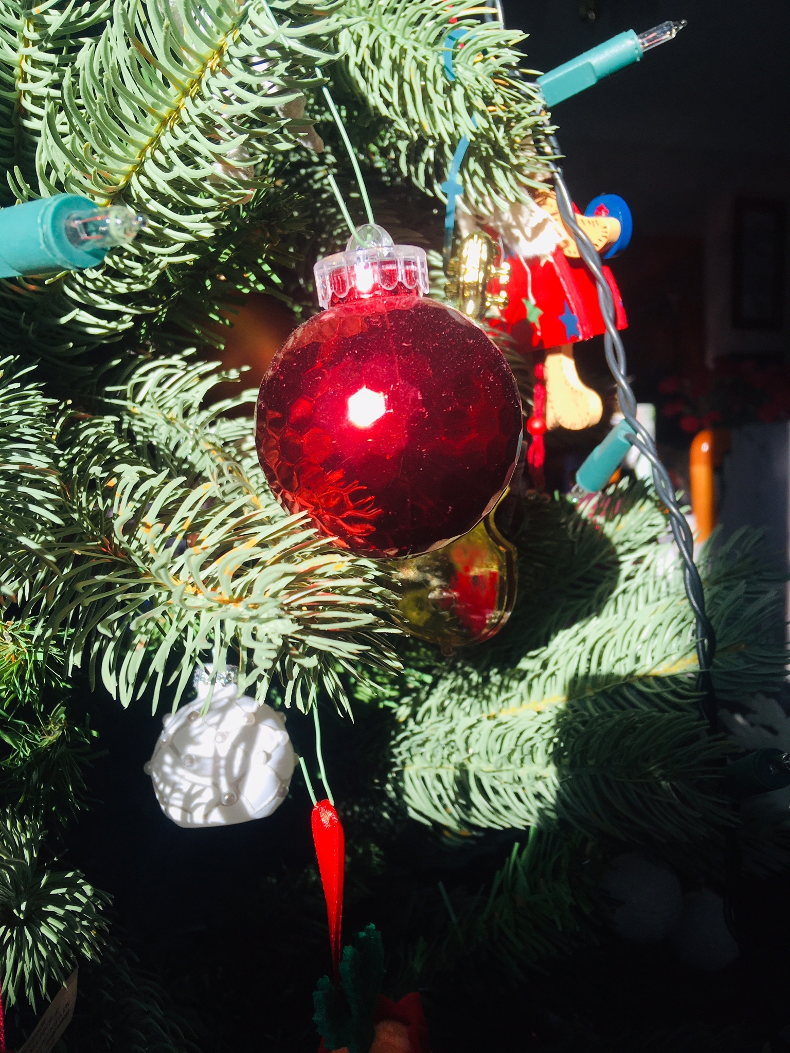 A glint of Winter Sunshine reflects from the panel of a “Telstar” Christmas decoration on a Christmas tree.
