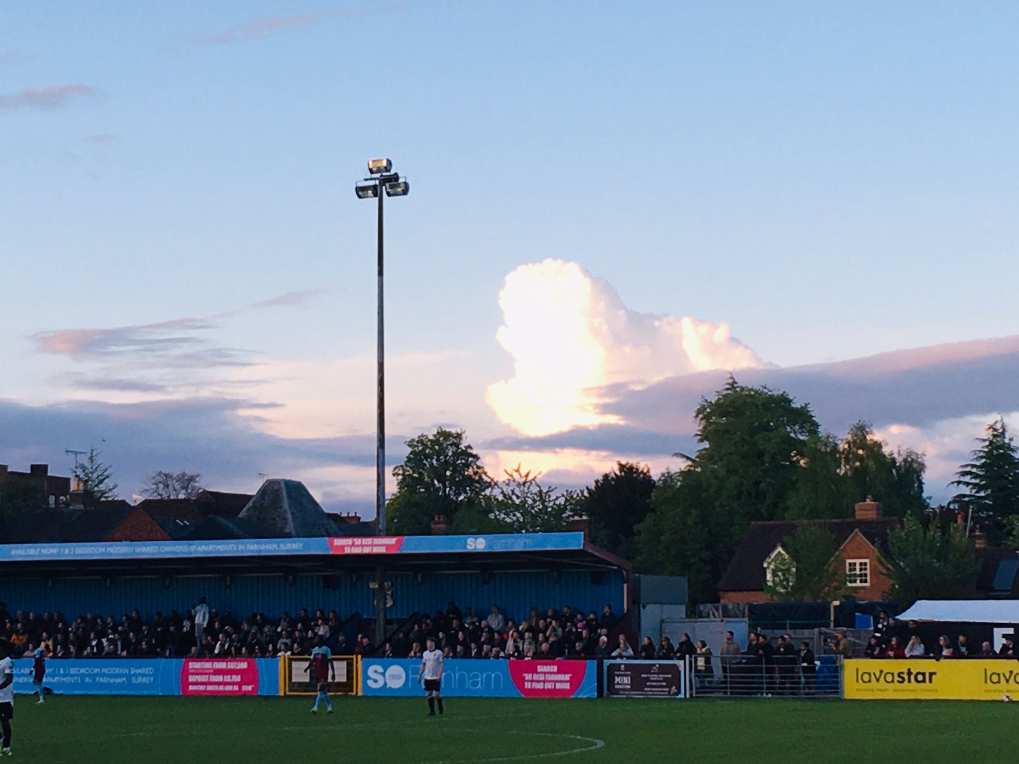 A Cumulus Nimbus cloud builds above the stand of Farnham Town FC and is lit by the Sun. The storms have passed Farnham for the day, but as darkness falls, an occasional distant flicker of lightning can be seen.