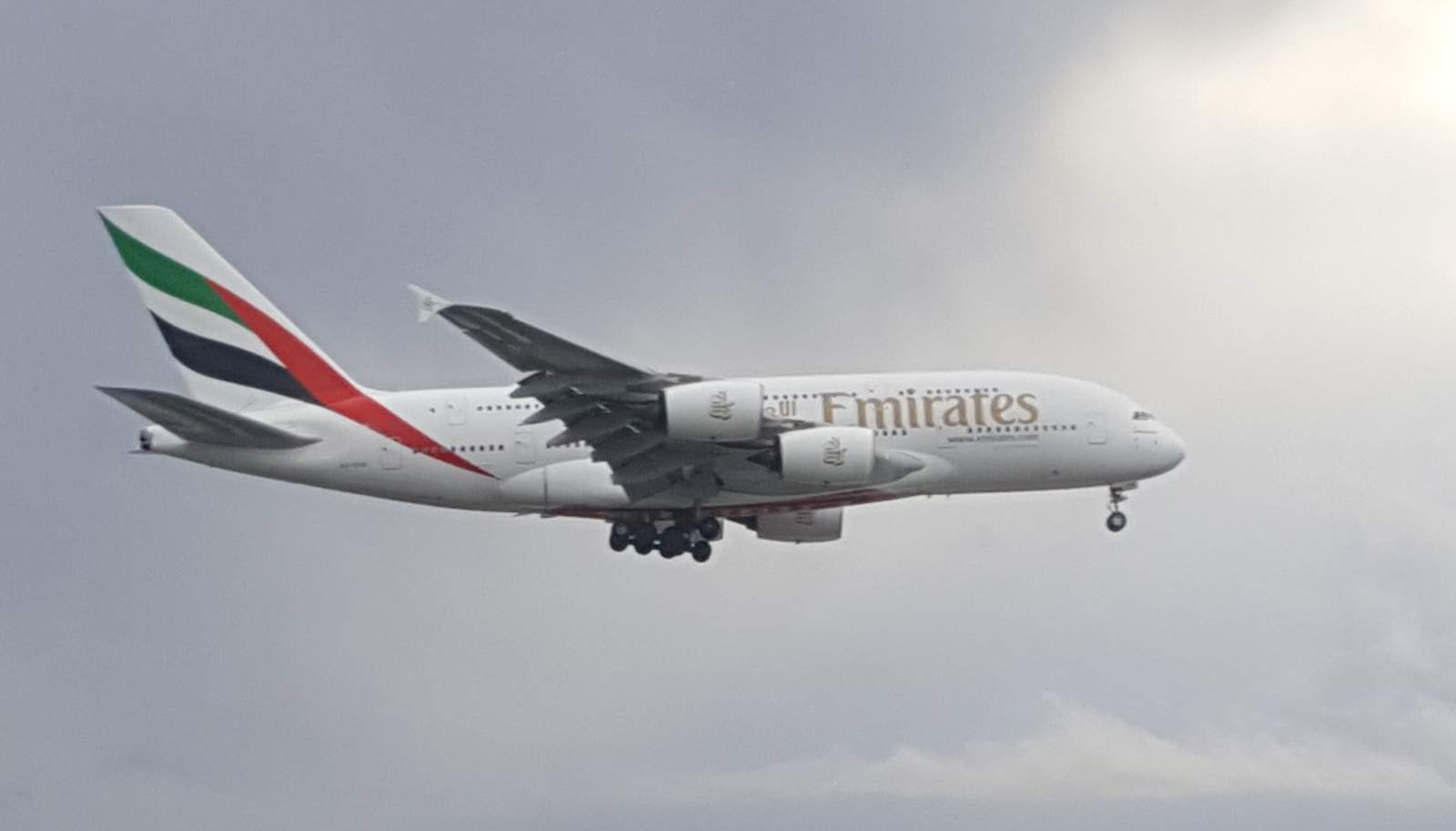 An Emirates Airbus A-380 coming-in to land at London Heathrow Airport on the afternoon of 12th December, 2023