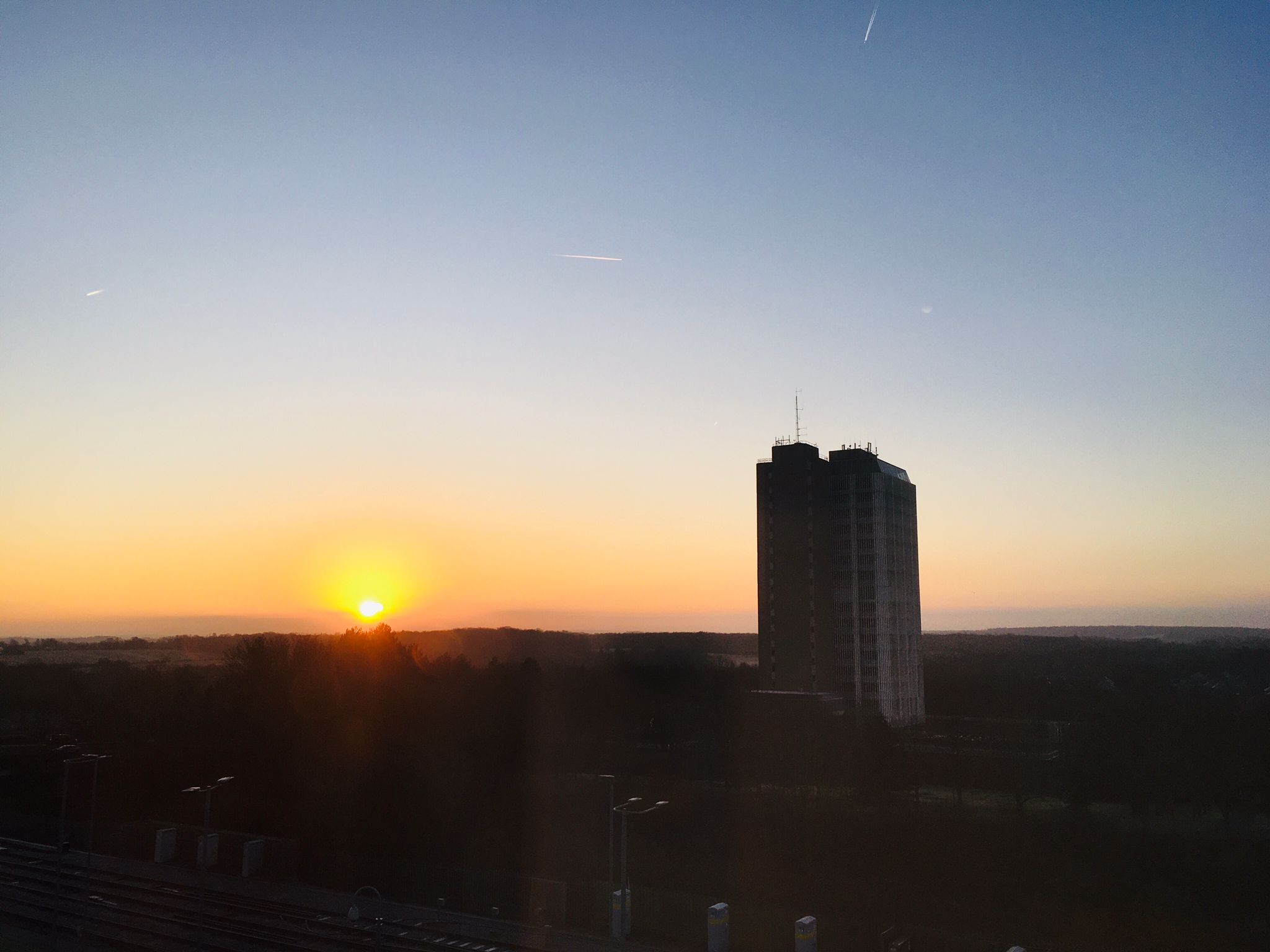 The Sun is seen rising over Fanum House (AA HQ) on a cold January morning in Basingstoke, Hampshire, England.
