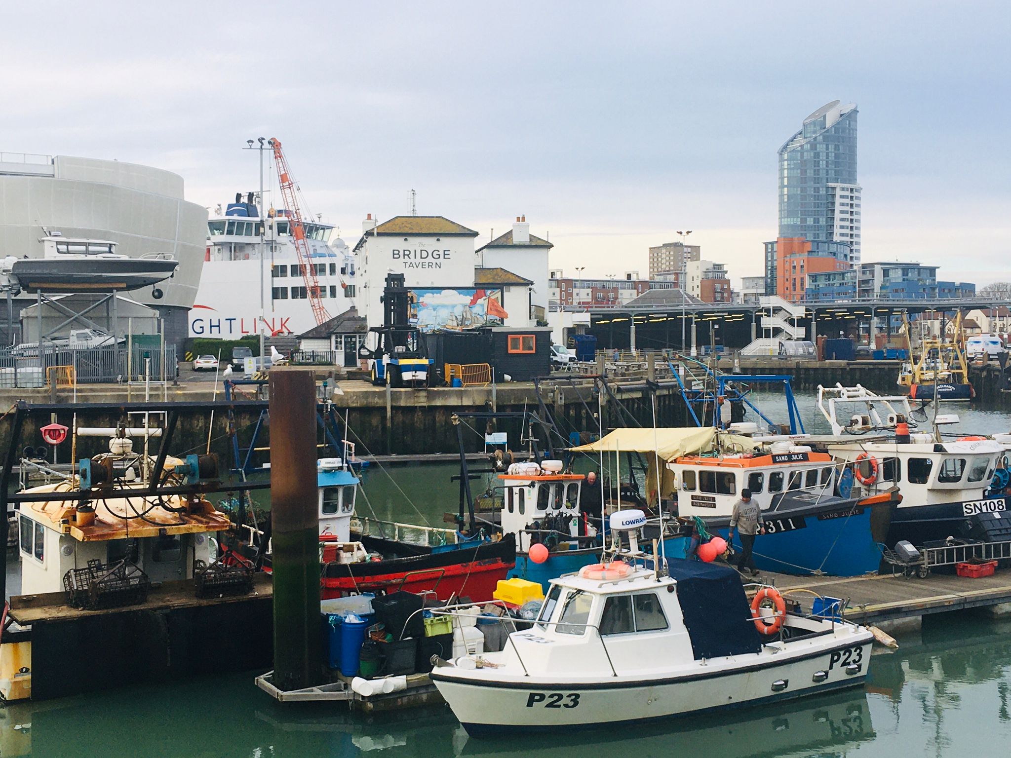 A wonderfully cluttered view of Camber Dock in Old Portsmouth! Local fishing vessels jostle with Wightlink ferries against the backdrop of the wonderful Bridge Tavern, Ben Ainslie Sailing Centre and the iconic lipstick shaped Number 1 Gunwharf Quays tower block.