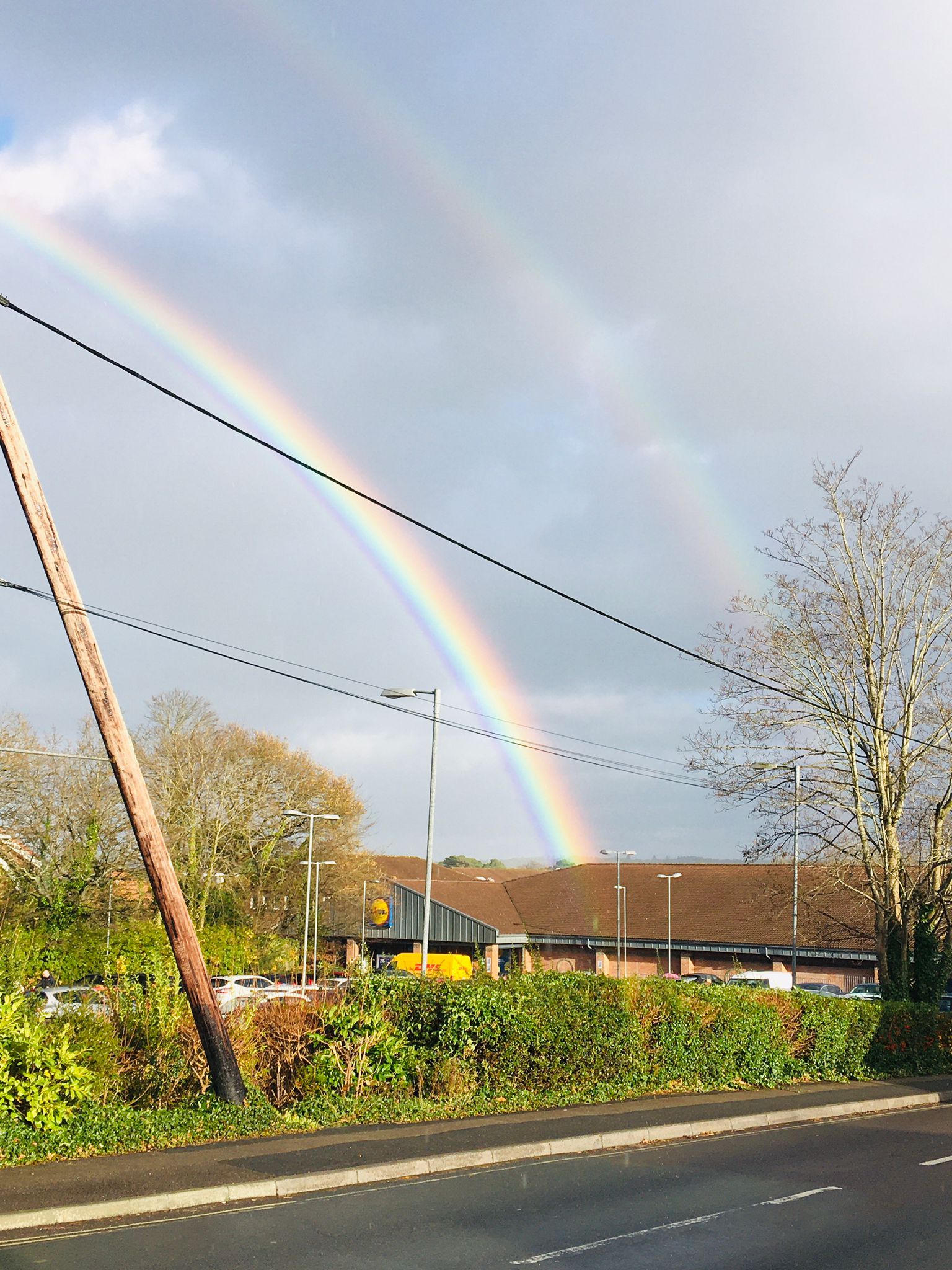 The end of the main rainbow seems to come to ground in the Forest Centre in Bordon, England. Despite looking hard, the author could not find the promised crock of gold!