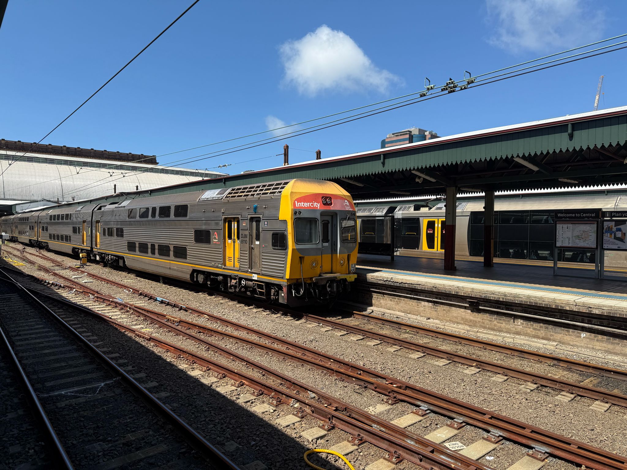 An Australian V Set Electric Multiple Unit sits at Sydney Central Station awaiting its next run.