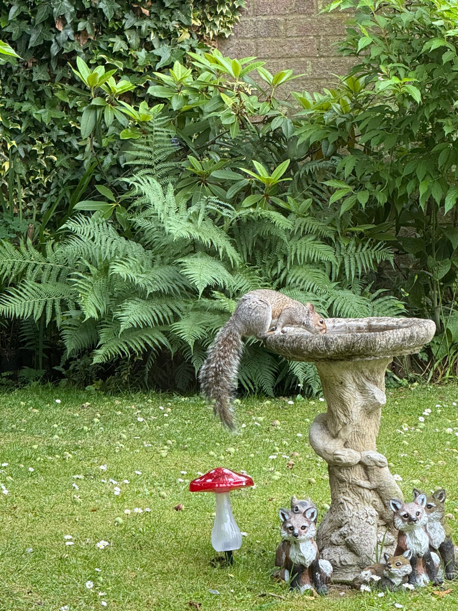 A Grey Squirrel enjoys a drink from the bird bath in the contributors garden!
