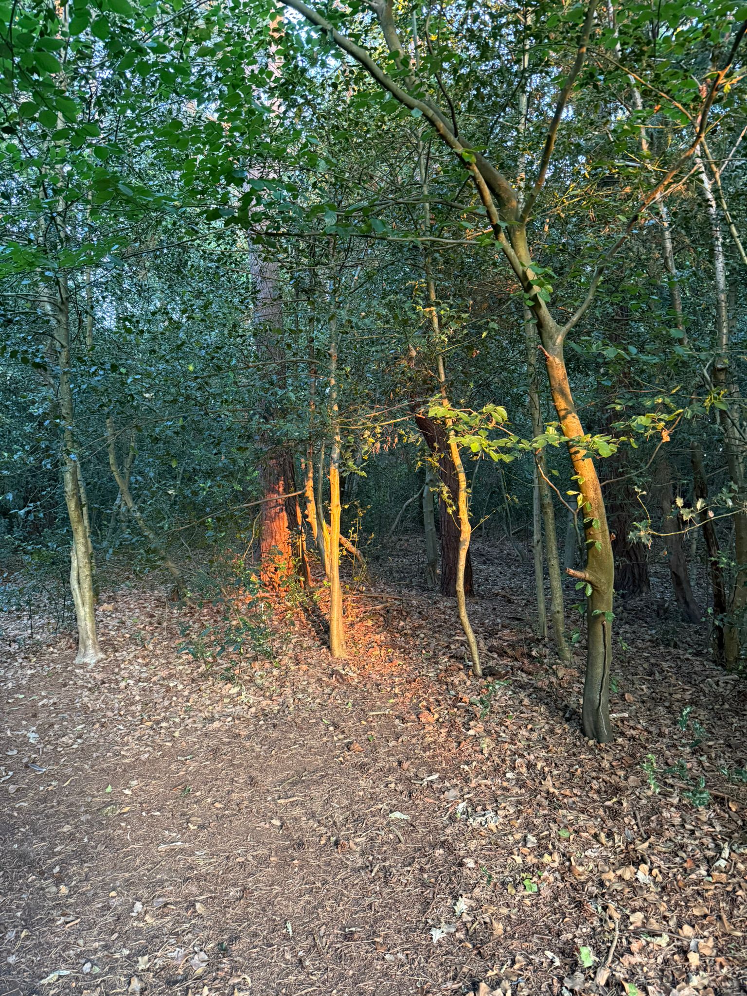 Most of the Hogmoor Inclosure in England is in early twilight, but a shaft of Sunlight still pitches in from the West from the low Sun. This phenomena occurs in a particular part of the forest due to the geography of the hills and building to the West and the slight incline of the path into the forest. If you were of such belief, you could think this is an entrance to an enchanted fairy kingdom!