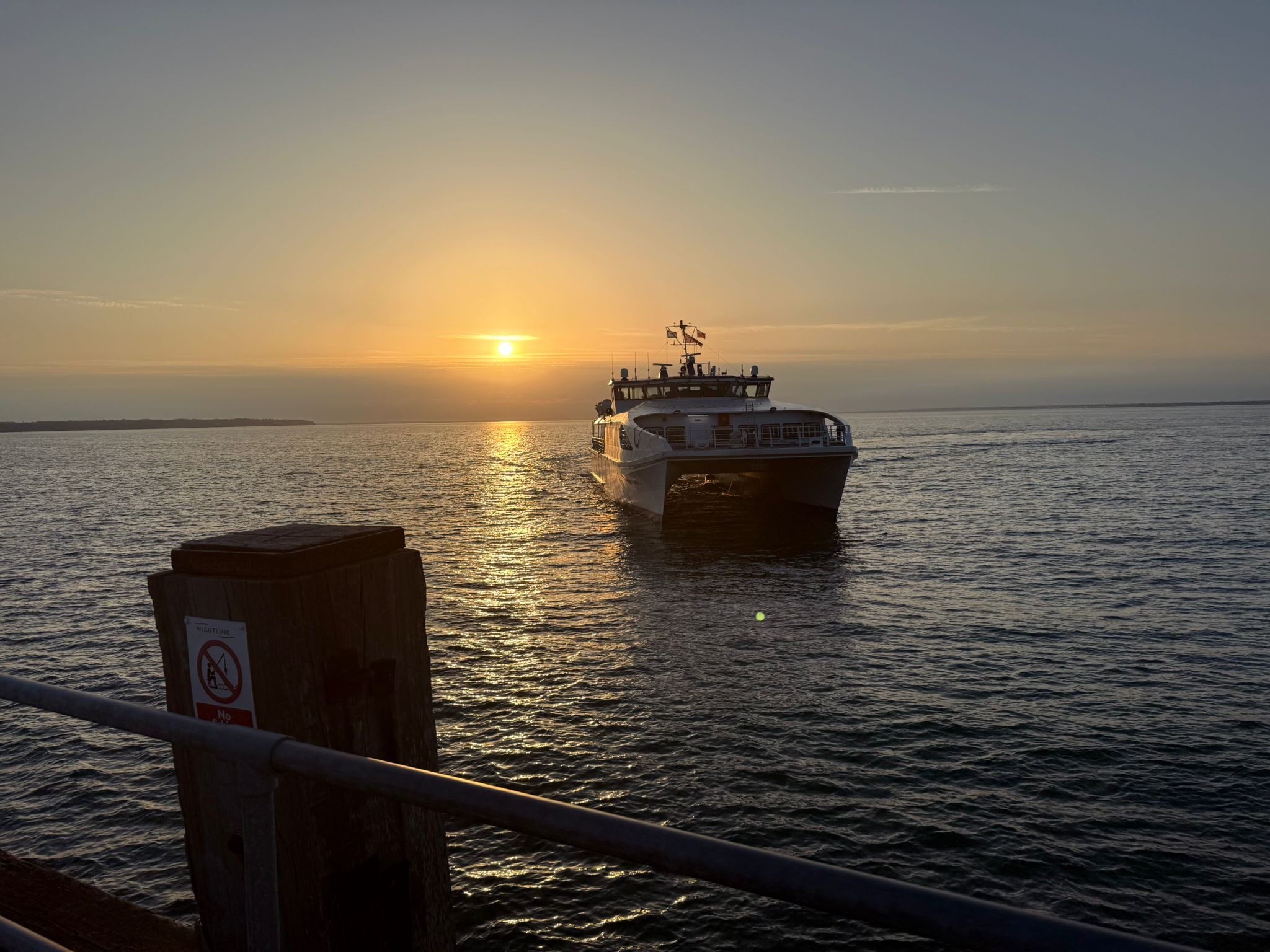 Unfortunately the photographer didn’t record which vessel this was but it is either Wight Ryder I or Wight Ryder II on the 20:20 Portsmouth Harbour to Ryde Pier sailing. The Sun is setting on a hot day and the Solent is a perfect calm.