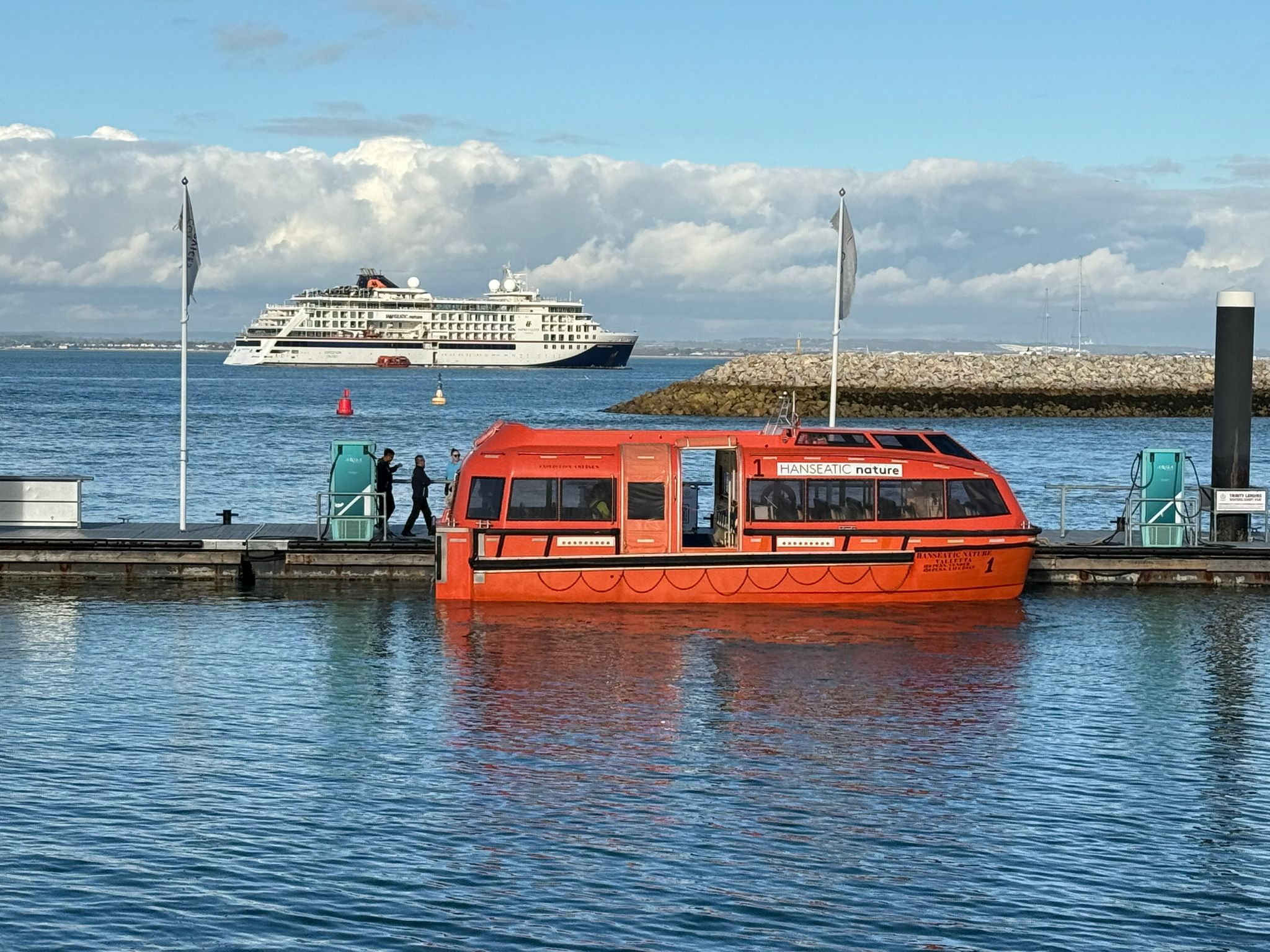 The Hanseatic Nature is a cruise ship operated by Hapag Lloyd. In this delightful shot, the Hanseatic Nature can be seen in the background with one of her tenders along side the quay ferrying passengers to and from the ship.