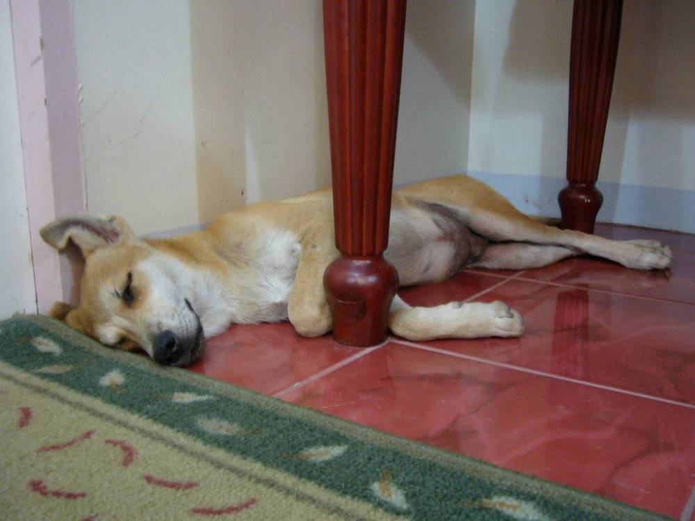 Unlike Shoubi, my Pit Bull Terrier bitch, he seems to prefer the bare floor tiles to the rug provided for him!